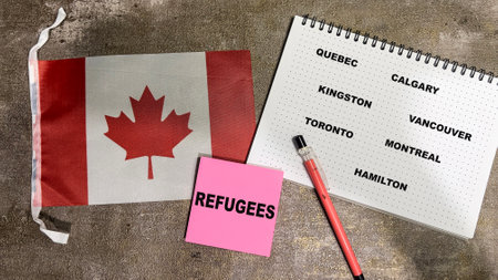 Concept of Refugees write on book and Flag of the Canada isolated on Wooden Table.