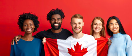 Beautiful young friends with Canadian flag on color background. High quality photo