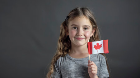 Little girl with a Canadian flag in her hand on a gray background