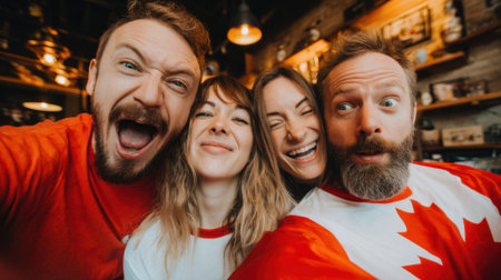 A group of four friends, dressed in red and white, are taking a selfie. They look very excited and happy, possibly at a sports event.