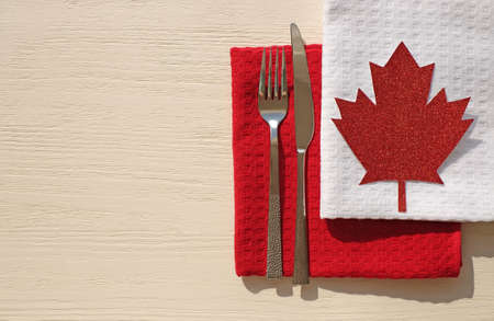 Table setting in the style of Canada colors, outdoors, top view, copy space