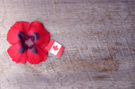 red poppy flower bloom on rustic wooden background with copy space with Canadian flag