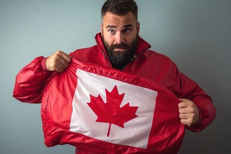 Man stretching jacket to reveal shirt with Canada flag printed