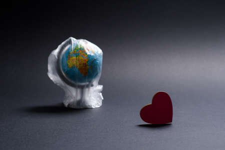 Small heart on the background of a globe wrapped in a plastic bag on a dark background. The concept of protecting the environment from plastic. Selective focus on the heart.