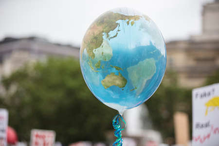 A homemade poster depicting planet earth is seen close up, as an environmental campaigner marches against climate change on an urban city street.