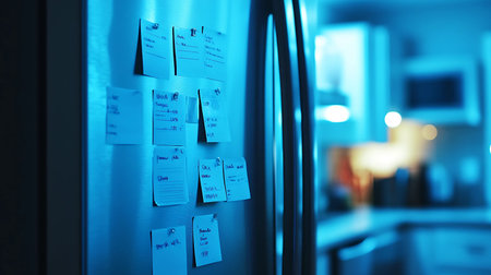 Close-up of sticky notes on refrigerator in modern kitchen at night