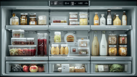 Inside the organized fridge every item has its place. The top shelf contains large colorful salads in clear containers while the middle shelf features neatly organized jars of.