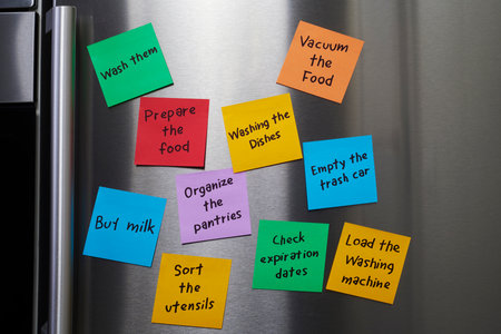 a stainless steel refrigerator door covered with colorful sticky notes listing household and kitchen tasks such as prepare the food, washing the dishes or check expiration dates
