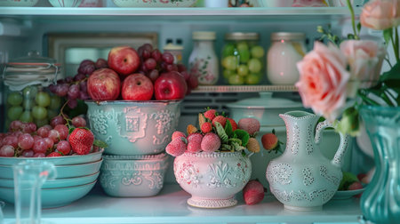 Fruits, flowers, and food styling: organized fridge interiors, modern home decor, fresh elegance