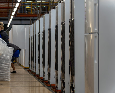 An assembly line or warehouse showing a row of modern refrigerators in a factory, with a blurry background of workers and industrial equipment, signifying manufacturing.