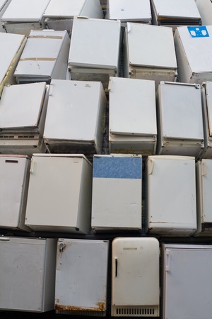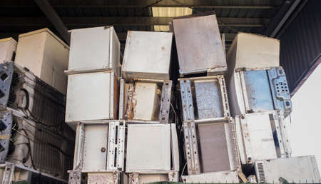 Huge piles of refrigerators stacked at recycling plant. low-angle view