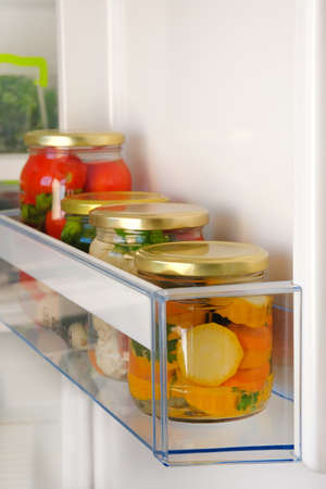 Variety glass jars homemade pickled vegetables on shelf of refrigerator. Fermented healthy natural vegetarian food concept.