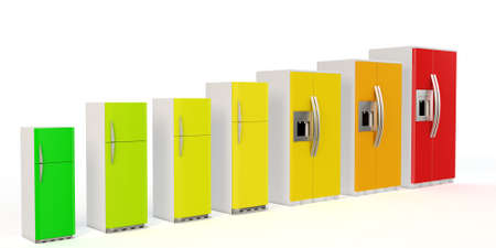 Pastel pink, beige, green, blue, grey color refrigerators set on white background. 3D Rendering