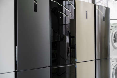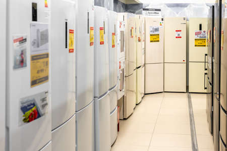 Kassel, Germany - March 28, 2022: Row of Refrigerator in Hypermarket store. Exposition sale of refrigerators in a household appliances store. Rows of refrigerators in appliance store