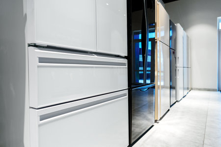 A couple examines modern refrigerators in a store display, deciding on the perfect choice. The vibrant setting emphasizes their interest in advanced home appliances.