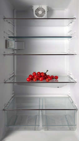 Empty refrigerator concept. Empty shelves of new refrigerator. Weight loss diet concept.