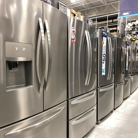 Panorama view close-up of large stainless-steel and compact refrigerator with product tag in Dallas hardware store. Blurred background includes boxed inventory, other appliances in retail aisle. USA