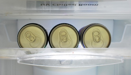 Two metal beer cans inside in empty clean refrigerator with opened door