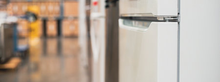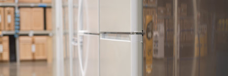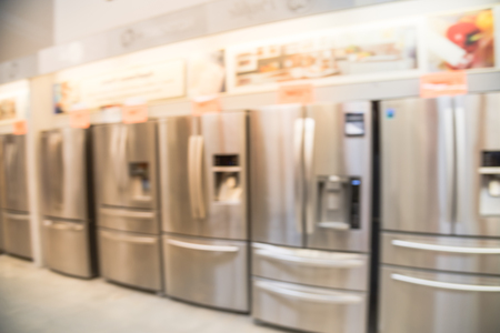 Panorama view row of refrigerators in Dallas appliance store with price tags, polished floor. Blurry background shelves, boxes, forklift pallet mover in warehouse setting, home improvement store. USA