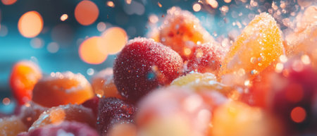 A mix of frozen berries covers the surface, showcasing their rich colors and textures.