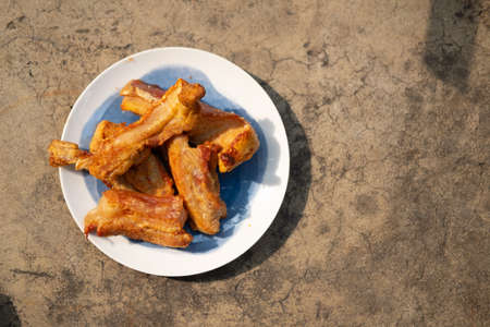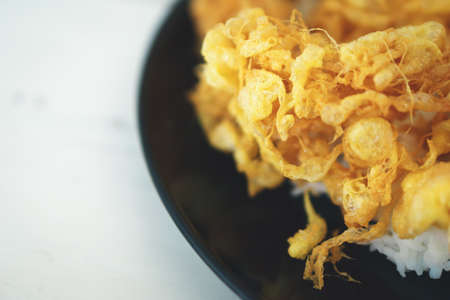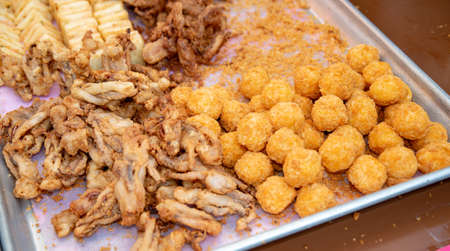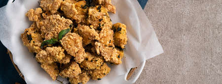 Top view of delicious fried popcorn chicken food in Taiwan for famous night market street food delicacy.