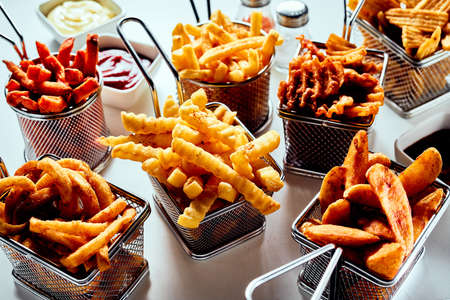 From above of tasty various French fries and crispy potato chips in baskets on white background
