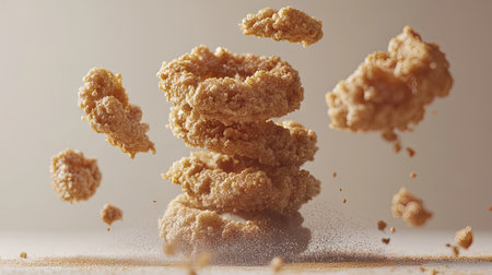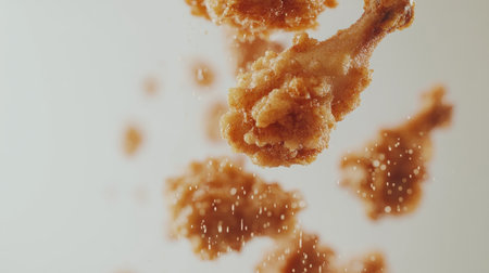 A close-up of crispy fried chicken pieces floating in mid-air, with a neon green backdrop, giving a vibrant and exciting look to the food.