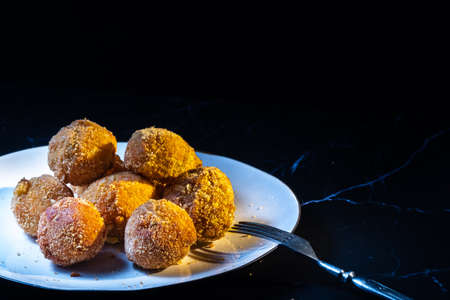 cheese balls with garlic and dill inside for a snack in a white plate on a black background.