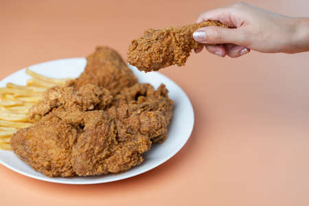 Hand holding drumsticks, crispy fried chicken with french fries in white plate on orange background.