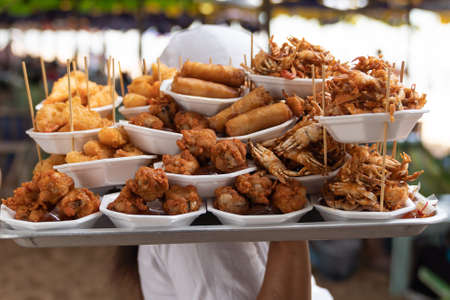 deep fried seafood (shrimps and squid) with mix vegetable - unhealthy food style