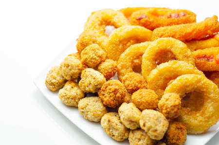 Southern fried and roast chicken bites, onion rings and mozzarella stick served on the white plate, buffet