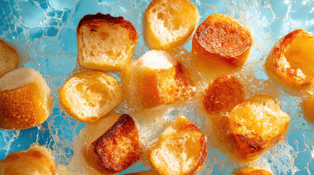 A vibrant image of golden brown toasted bread pieces creating splashes in a colorful blue background. This visually appealing photo captures the texture and deliciousness of crispy bread. Perfect for culinary art or food-related themes.