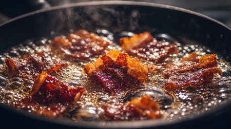 Fresh bacon crackling in a pan, mid-sizzle with bubbling fat and sharp detail