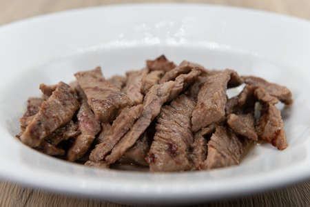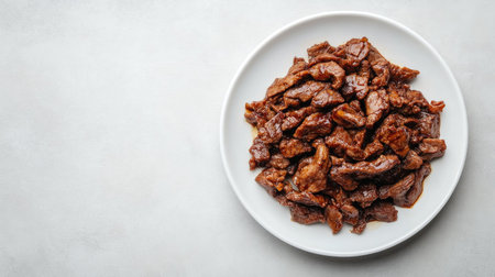 Succulent cooked beef chunks presented on a clean white plate against a soft background, perfect for showcasing culinary delights and tempting food enthusiasts in photography.