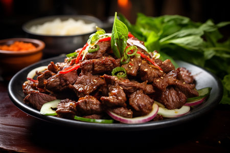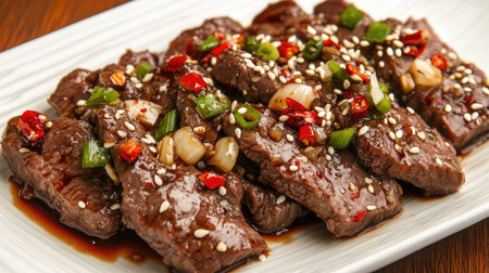 Enjoy a delectable presentation of beef slices drizzled with a flavorful sauce, garnished with fresh vegetables and spices, perfect for any meal.