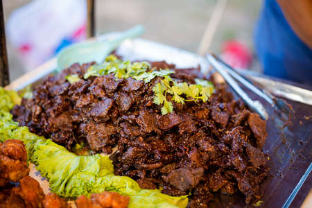 Fresh asian spicy black soy sauce aromatic beef slices on local market in Krabi town. Traditional thai cuisine made of fresh ingredients.