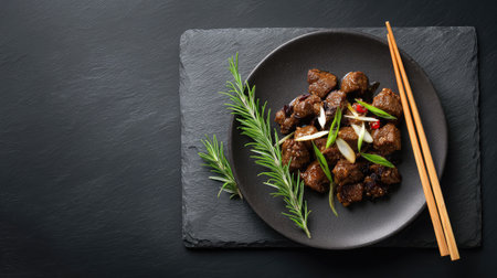 A beautifully arranged savory beef dish garnished with herbs and fresh onion served on a sleek black slate plate with chopsticks, perfect for any dining occasion.