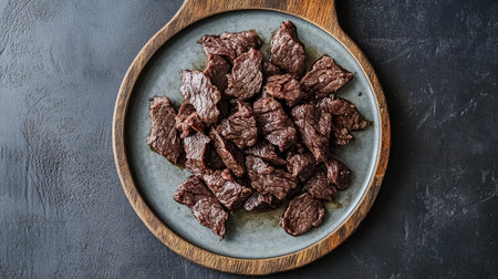 Explore a rustic presentation of savory dried beef on a stylish plate. Perfect for snacking, meal prep, or enhancing your gourmet dishes with rich flavor.
