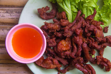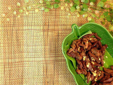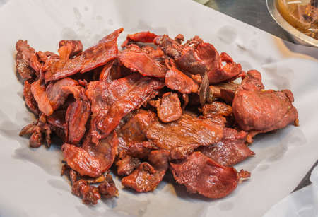 image of Northern Thai style salty fried pork on paper ,Chiang Mai , Thailand