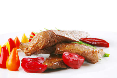 Cooked meat on a tray. Meat with chili pepper. Delicious veal medallions. Incredible taste of european cuisine.