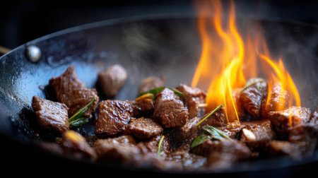 Experience the vibrant culinary moment of tender beef searing in a pan with flames, fresh herbs, and a mouthwatering aroma. Perfect for food lovers!