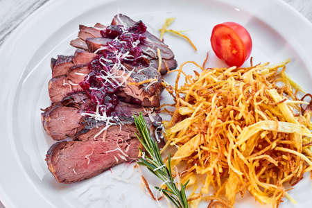 Sliced baked beef with french fries, sauce, tomatoes and rosemary on a white plate and a light wooden background
