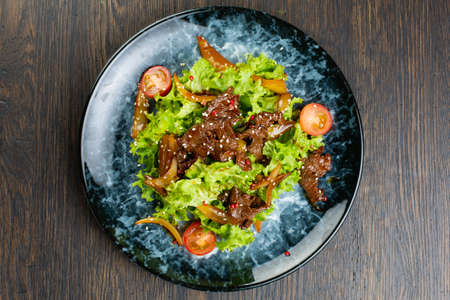 Side view on asian roasted beef dish with vegetables in spicy sauce on the wooden table, horizontal