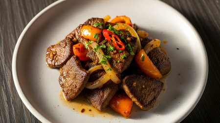 A savory dish of sauteed liver pieces cooked with caramelized onions and red bell peppers is presented on a ceramic plate. The meat is browned and glossy, garnished with fresh herbs and a slice of red chili.