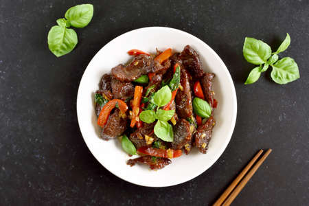 Thai style stir-fry beef with vegetables in bowl. Top view, flat lay