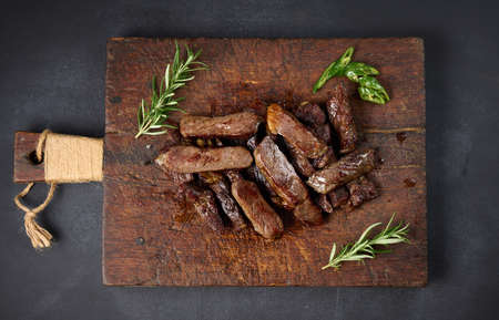 roasted piece of beef ribeye cut into pieces on a vintage brown chopping board. Well done. Appetizing steak, top view