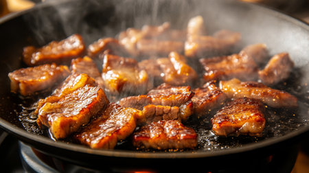 A dynamic image of sizzling pork belly being fried in a pan, with steam rising and the texture of the meat highlighted, evoking the cooking process