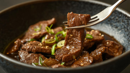 A closeup of tender beef slices garnished with green onions in a rich sauce. Perfect for food lovers looking to enhance their culinary experiences.