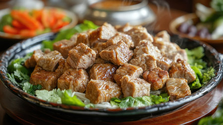 A steaming platter of crispy pork with glistening skin, served on a traditional Thai-style table setting, evoking a sense of warmth and flavor.