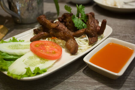 Hot and Spicy Grilled Pork Sala , Thai name is Nam Tok Moo, Thailand food .